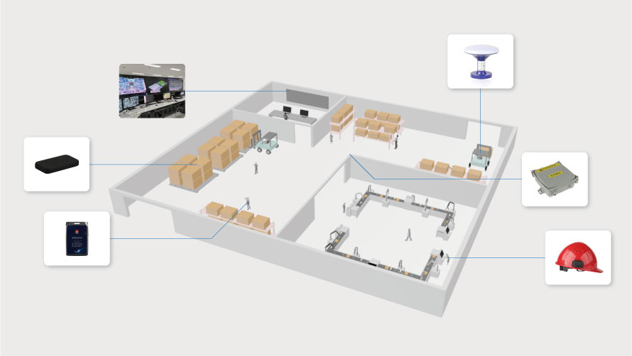 真源科技工厂人员定位解决方案,工人佩戴定位安全帽,定位安全帽实时发送位置信息至定位基站,定位基站传输至定位引擎,定位引擎推送位置信息至应用软件。应用软件实时展示工人信息。