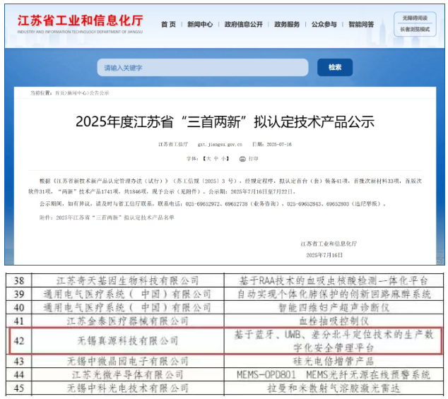 | 近日,无锡真源科技有限公司自主研发的 “基于蓝牙、UWB、差分北斗定位技术的生产数字化安全管理平台” 成功入选 2025 年度江苏省新技术新产品名单,经江苏省工业和信息化厅评审,成为生产安全数字化领域的标杆解决方案。 |