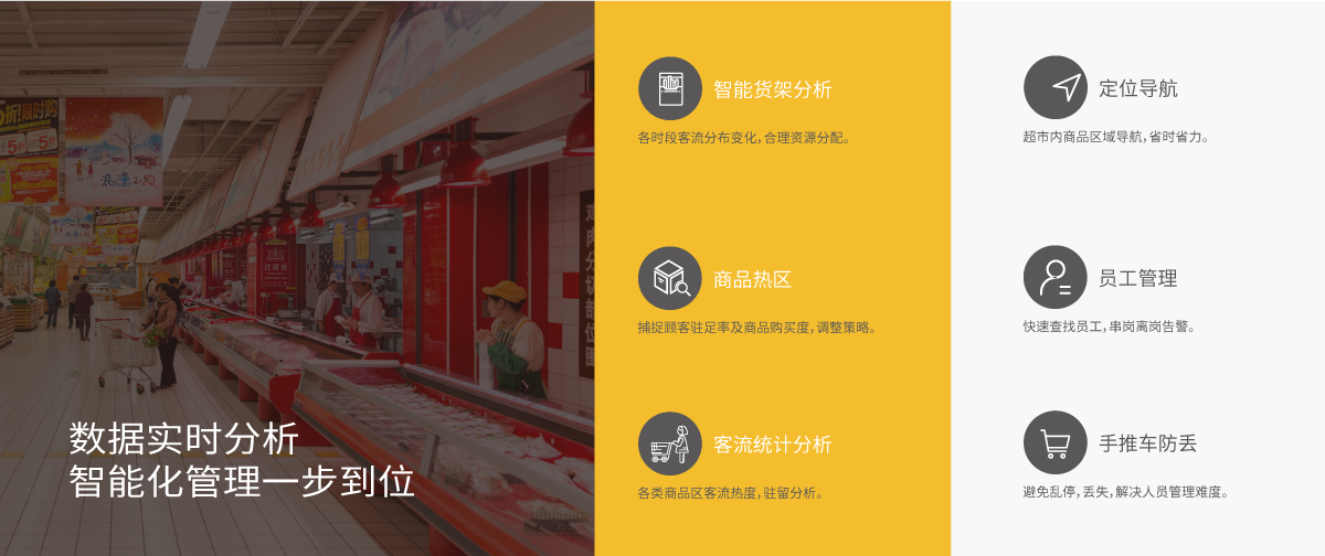 真源科技真源超市手推车定位方案,已应用于100家以上超市,通过对手推车进行定位,对人流量进行智能分析,通过大数据优化货架分布,优化客户体验。人工智能时代越来越成熟,开启了零售业的新篇章,自动生成数据,让商品和人联动起来,对于厂商形成了直接的指导,对不同顾客不同需求定制化服务,使顾客在不知不觉中习惯智能化购物的美好体验。数据实时分析,智能化升级管理,并增加安防保障,助力可视化运营。采取安全可靠的无线+物联网,实现智慧商超。